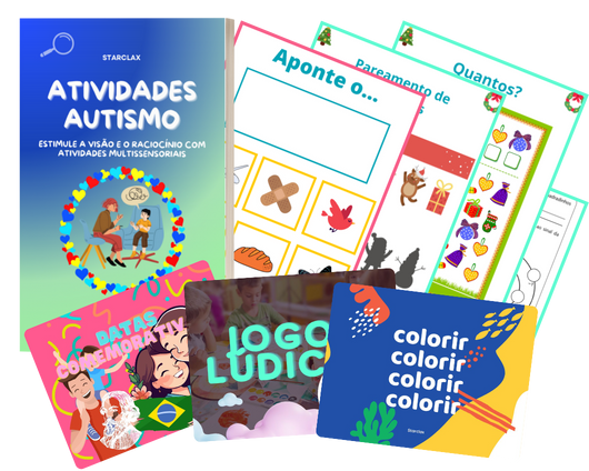 Desenvolvido por especialistas, nosso kit de atividades não apenas acelera o desenvolvimento, mas também estimula a curiosidade e criatividade da criança, independentemente do grau de autismo.